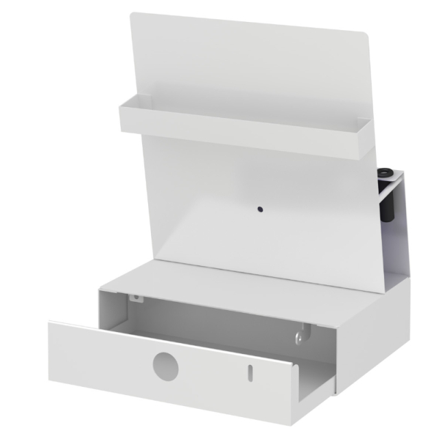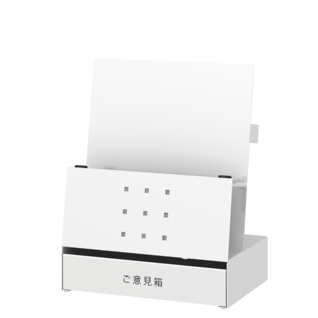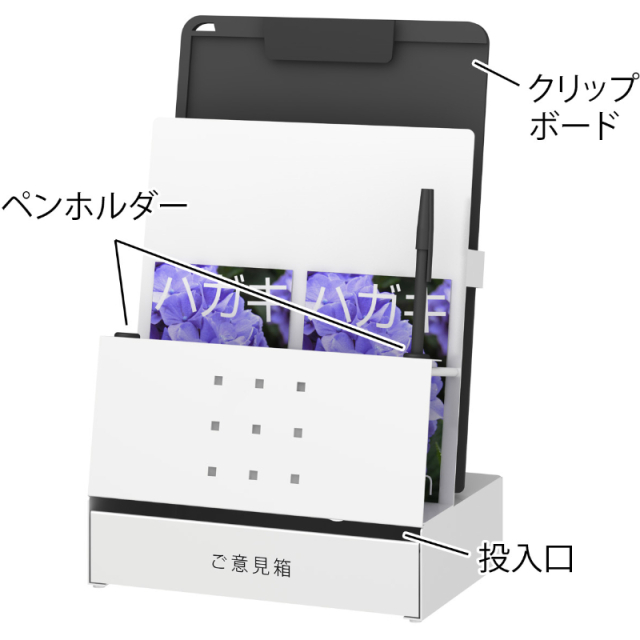 アンケート用紙が収納でき、記入に必要なペンやクリップボードも立てられるオールインワンのご意見箱です。