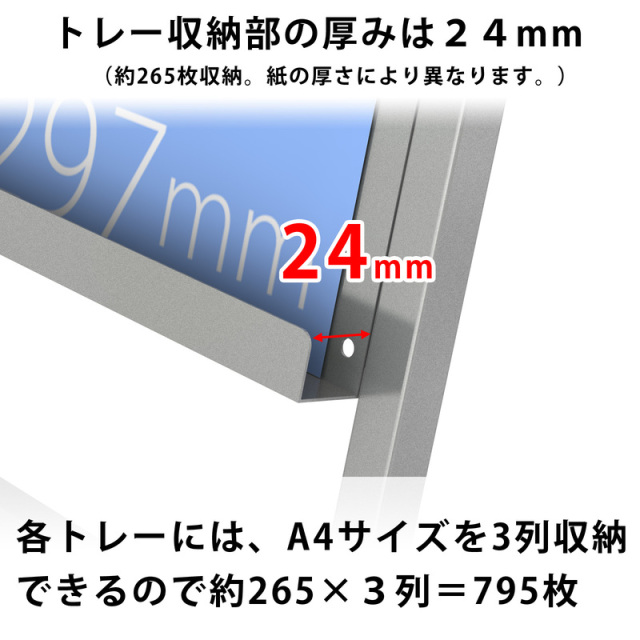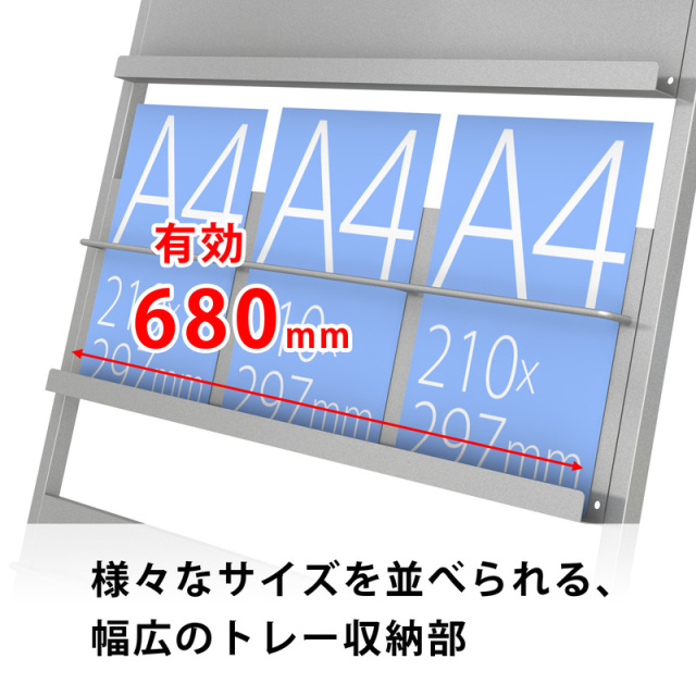 1段が一枚のトレー形状になっているため、一般的なA4サイズはもちろんのこと、A4三つ折り、A3(ヨコ)、B5などの様々なサイズの紙に対応することができます。 横幅はA4・B5タテなら3列、A4三つ折りサイズなら6列並べることができるゆとりのあるサイズ感です。